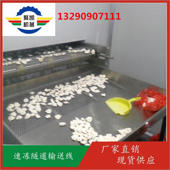河南郑州荥阳聚凯食品机械厂,是一家专业的食品机械制造机构;为了让人们能吃上“放心肉”;也为了避免冻肉在加工过程中营养成分的流失;就在原有设备:绞肉机、斩拌机、破骨机、提升机、和面机、真空包装机、真空滚揉机、冻肉切块机等设备的基础上,又推出了一款适合于各种速冻食品的速冻隧道输送机。速冻水饺冷冻隧道输送机,可以根据客户实地需要量身定制符合客户需要的速冻隧道输送机,该机设计合理机械化自动效率高,可以定制单层平板式速冻隧道或者往复式速冻隧道,设计工艺灵活多样。饺子机生产后,成品饺子爬坡上到饺子输送机,饺子输送机把饺子集中传送到平板输送带。平板输送带将饺子运送到分散摆头,分散摆头均匀的将饺子散铺在冷冻网带上。经过约20--30分钟的速冻,饺子落入成品料仓,进行包装。生产工艺完成,从饺子机出来饺子到成品出库,中间只需一人巡回检查。