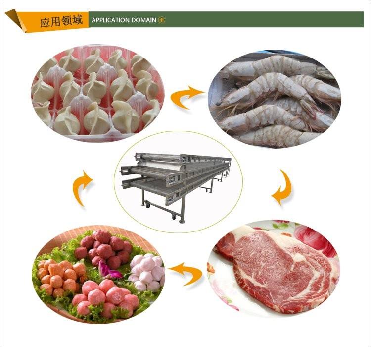 平板速冻隧道也称单层网带,可广泛用于饺子、汤圆、馄饨、包子的生产,指的是冷冻隧道内的主网带是单层304不锈钢宽网,一般规格为1300mm×2800mm×800mm以上,具有噪音低,结构简单,使用方便,受冷均匀,大大减少人工使用,速度快,产量高,1000kg/小时,甚至更大,对速冻冷库的要求高,受厂房场地的局限性大,占地面积加大,冷源配置大,一般为新厂建设或用地面积宽松,资金雄厚,产量要求大的客户采用。整机采用工业方管制作,由饺子输送机,平板输送带,分散摆头,速冻网带和成品料仓组成,功率全部共计4kw左右,变频调速,链条传动,传送皮带为食品级皮带,安全卫生无异味,使用寿命长,符合国家检测标准。